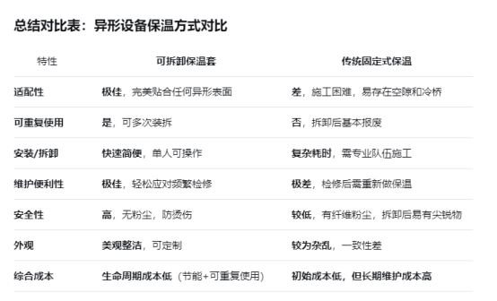 對于形狀不規(guī)則、需要頻繁維護或檢修的異形設備,使用可拆卸保溫套不是一種簡單的替代選擇,而是一種在保溫效率、維護便捷性、安全環(huán)保和長期經濟效益上都具有壓倒性優(yōu)勢的現代化解決方案。它特別適用于石油化工、制藥、食品飲料、電力、新能源等對工藝溫度控制和設備維護要求高的行業(yè)。