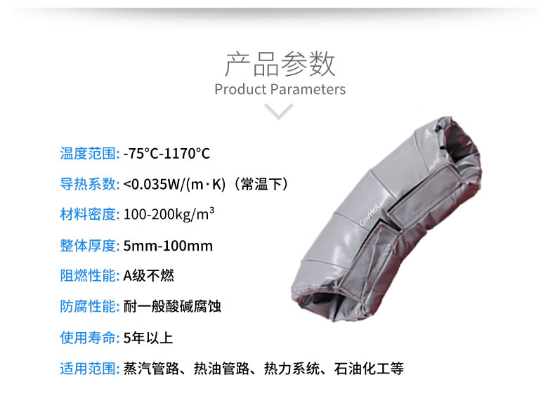 蒸汽管道保溫衣可根據不同形狀的設備量身定制各種保溫層,適用于飲料,食品,石油化工,冶金,造紙,電力等行業,其材料為特殊材料,隔熱性能良好,使用壽命長,不易老化,大大提高了利用率和降低維修維護成本。韌性好,易于彎曲聯接。可以大大改善工作環境,降低工作環境溫度,重要的是防止工作人員出現意外。