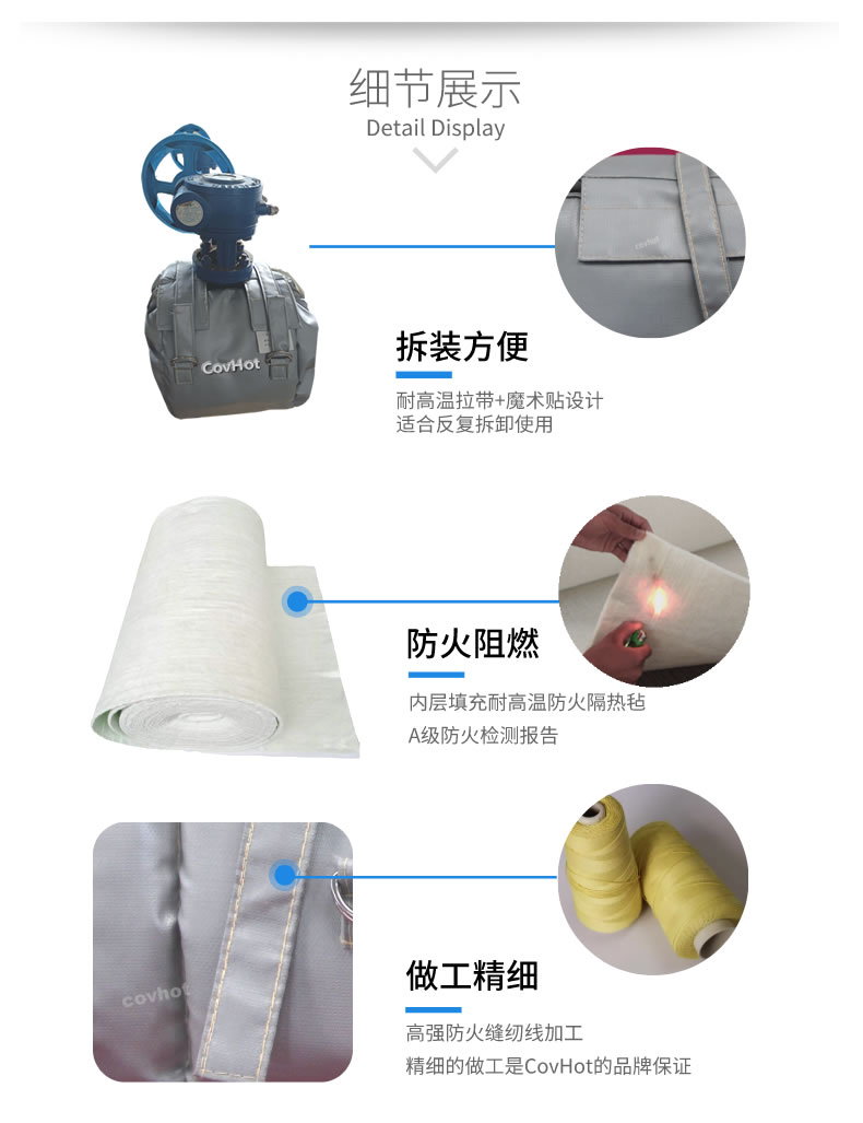 冬季來(lái)臨時(shí)要檢查、經(jīng)常排污,防止包裝的保溫材料破損??刹鹦兜y閥門(mén)保溫套采用耐高低溫、防火保溫材料;有內(nèi)襯、中間保溫層、外保護(hù)層三層組成;根據(jù)管道或設(shè)備的具體形狀及其使用環(huán)境,經(jīng)過(guò)精心設(shè)計(jì)、測(cè)繪后,通過(guò)特殊工藝制作而成。而傳統(tǒng)的保溫產(chǎn)品在每次檢修時(shí)會(huì)損壞,只能一次性使用。