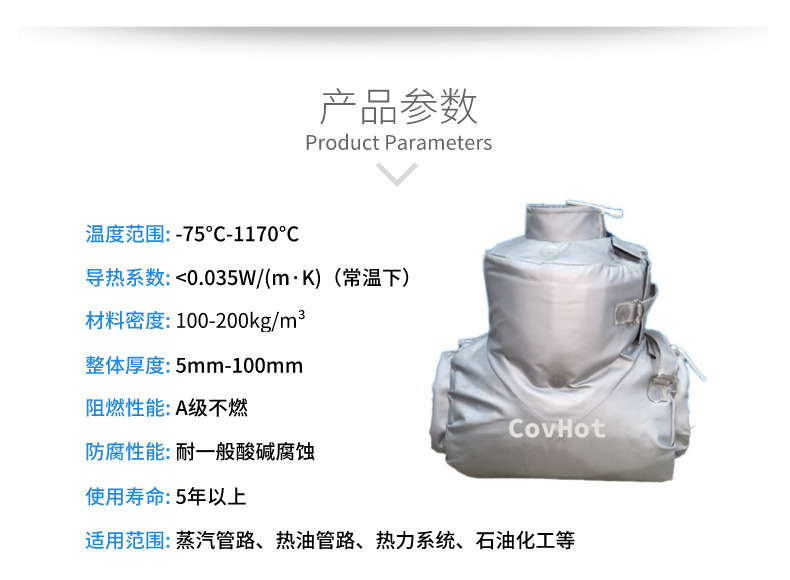 可拆卸截止閥保溫套可以滿足不同領(lǐng)域的柔性保溫應(yīng)用需求。可以很方便進行拆裝操作,可重復(fù)多次使用,以最大化其經(jīng)濟效益,降低熱損耗。對于一些表面形狀特殊、復(fù)雜的設(shè)備隔熱(防火),柔性隔熱防火)套也能顯示其獨特的優(yōu)勢。經(jīng)測試計算,采用本產(chǎn)品后,通??晒?jié)約熱能達90%以上。有些用戶短投資回收期僅為6個月左右。