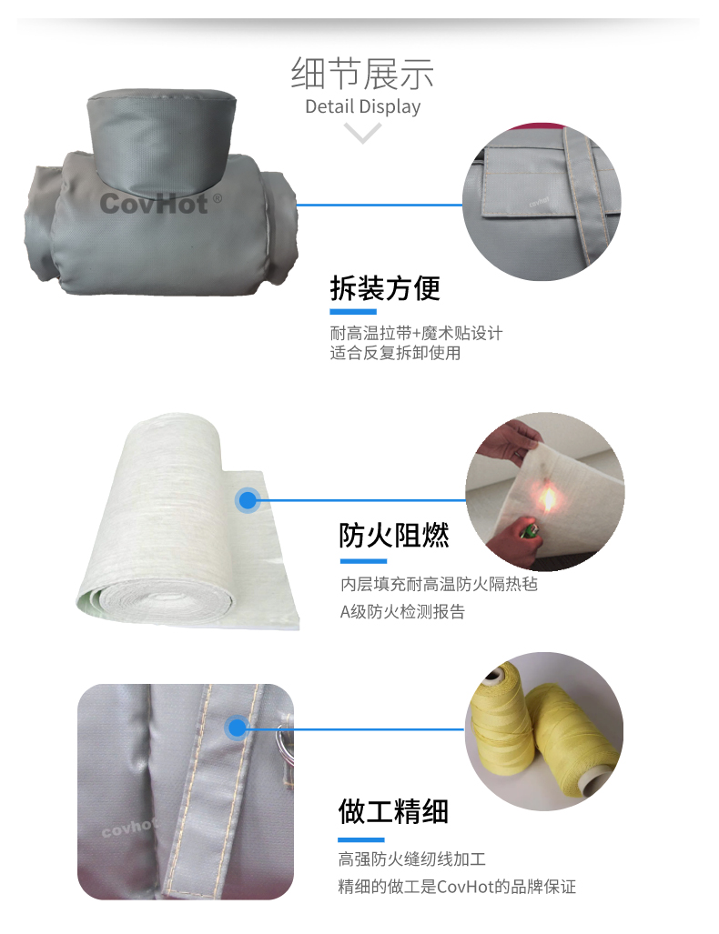 閥門內(nèi)部介質(zhì)通常為各種化工原料,柔性可拆卸閥門保溫套使用的材料可防火阻燃,能夠有效防止因介質(zhì)泄露引起的火災 ,另外閥門運行時溫度較高,易受熱膨脹,“披覆保溫”原材料柔韌性較好,能夠?qū)﹂y門的膨脹進行補償,不會出現(xiàn)保溫性能下降現(xiàn)象,有利于閥門機組安全運行,大大提高設(shè)備運轉(zhuǎn)率,增加經(jīng)濟效益;