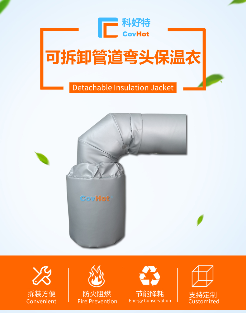 彎頭保溫套,也可以叫做彎頭可拆卸保溫衣,彎頭可拆卸保溫罩。彎頭保溫套使用耐高低溫、防火保溫材料制作而成,拆卸安裝方便簡單,保溫隔熱性能高,可使高達500°C的管道表彎頭面溫度降低至50℃以下。