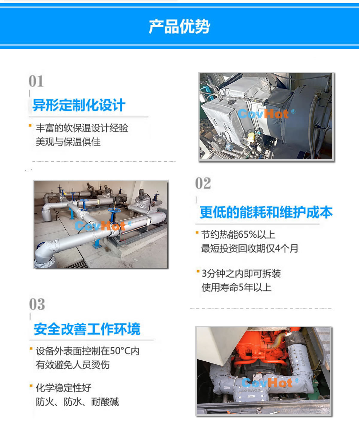 硫化系統(tǒng)中設(shè)備運行時的溫度較高,使用硫化機可拆式保溫衣是非常不錯的絕熱措施,能夠有效減少熱損失,改善生產(chǎn)車間夏季環(huán)境溫度,減冬季硫化機欠硫等情況。