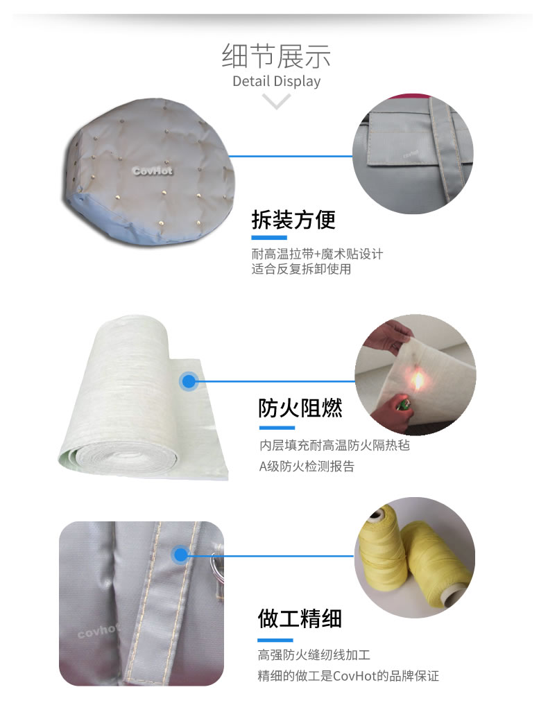 柔性可拆卸人孔保溫隔熱套可以很好的解決以上問題,產品耐高溫可達550℃,保溫隔熱效果好,可以很方便的進行人孔設備拆裝,方便清洗和維護,表面采用可擦洗材料,防水防油,耐腐蝕??梢苑磸筒鹧b使用。是工業進行人孔保溫的理想產品。